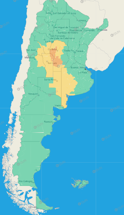 Córdoba: General Roca – Presidente Roque Sáenz Peña – Juárez Celman – Zona baja de Río Cuarto – Zona serrana de Calamuchita – Zona serrana de Río Cuarto – Oeste de Pocho – Oeste de San Alberto – Oeste de San Javier – Zona serrana de Cruz del Eje – Zona serrana de Minas – Zona serrana de Pocho – Zona serrana de San Alberto – Zona serrana de San Javier – Ischilín – Río Seco – Sobremonte – Tulumba – Río Primero – Río Segundo – Tercero Arriba