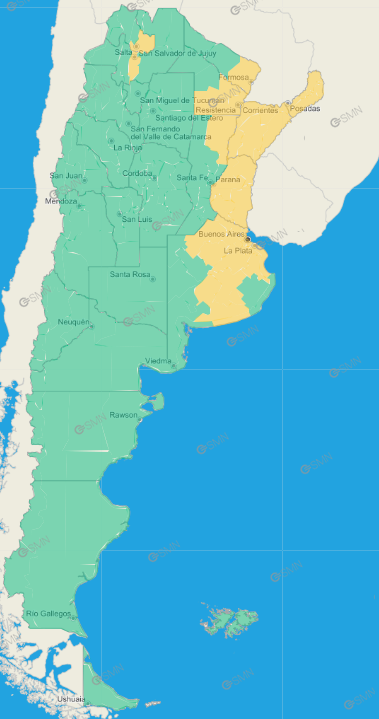 Buenos Aires: Escobar – San Fernando – San Isidro – Tigre – Vicente López – Campana – Exaltación de la Cruz – San Antonio de Areco – Zárate – Baradero – Ramallo – San Nicolás – San Pedro – Arrecifes – Capitán Sarmiento – Carmen de Areco – Chacabuco – Colón – General Arenales – General Pinto – Junín – Leandro N. Alem – Lincoln – Pergamino – Rojas – Salto – Alberti – Bragado – Chivilcoy – General Viamonte – Nueve de Julio – Veinticinco de Mayo – General Las Heras – General Rodriguez – Luján – Marcos Paz – Mercedes – San Andrés de Giles – Suipacha – General Alvear – General Belgrano – General Paz – Las Flores – Lobos – Monte – Navarro – Roque Pérez – Saladillo -Almirante Brown – Avellaneda – Berazategui – Florencio Varela – Lanús – Lomas de Zamora – Presidente Perón – Quilmes – Berisso – Ensenada – La Plata – Este de Castelli – Este de Chascomús – Este de Dolores – Este de Lezama – Este de Magdalena – Este de Punta Indio – Este de Tordillo – Oeste de Castelli – Oeste de Chascomús – Oeste de Dolores – Oeste de General Lavalle – Oeste de Lezama – Oeste de Punta Indio – Oeste de Tordillo – Pila – Azul – Rauch – Tapalqué – Zona baja de Benito Juárez – Zona baja de Tandil – Zona serrana de Benito Juárez – Zona serrana de Loberia – Zona serrana de Necochea – Zona serrana de Tandil – Adolfo Gonzales Chaves – Centro de Lobería – Norte de Coronel Dorrego – Norte de Necochea – Norte de San Cayetano – Norte de Tres Arroyos – General La Madrid – Laprida – Olavarría