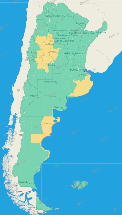 Buenos Aires: Adolfo Gonzales Chaves – Centro de Lobería – Norte de Coronel Dorrego – Norte de Necochea – Norte de San Cayetano – Norte de Tres Arroyos – Costa de Lobería – Costa de Necochea – Costa de San Cayetano – Costa de Tres Arroyos – Costa de General Pueyrredón – Costa de Mar Chiquita – General Alvarado – Pinamar – Sudeste de General Juan Madariaga – Villa Gesell – Zona serrana de Benito Juárez – Zona serrana de Lobería – Zona serrana de Necochea – Zona serrana de Tandil – Azul – Rauch – Tapalqué – Zona baja de Benito Juárez – Zona baja de Tandil – Ayacucho – Balcarce – General Guido – Maipú – Noroeste de General Juan Madariaga – Noroeste de Mar Chiquita – Oeste de General Pueyrredón – Este de General Lavalle – La Costa – Este de Castelli – Este de Chascomús – Este de Dolores – Este de Lezama – Este de Magdalena – Este de Punta Indio – Este de Tordillo – Oeste de Castelli – Oeste de Chascomús – Oeste de Dolores – Oeste de General Lavalle – Oeste de Lezama – Oeste de Punta Indio – Oeste de Tordillo – Pila