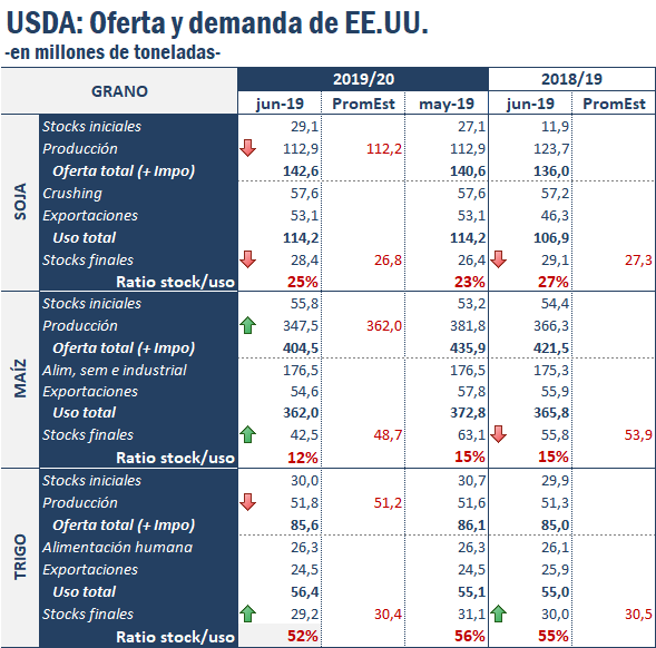 El Departamento de Agricultura no introdujo variaciones en su estimación productiva para Estados Unidos generando una presión bajista inicial en el mercado que esperaba una reducción en esta variable. Además, un aumento en la previsión de stocks iniciales para el ciclo 2019/20 conduce a mayores stocks a finales de campaña. El incremento de existencias finales resultó ser mayor a lo esperado por el mercado.