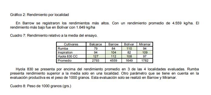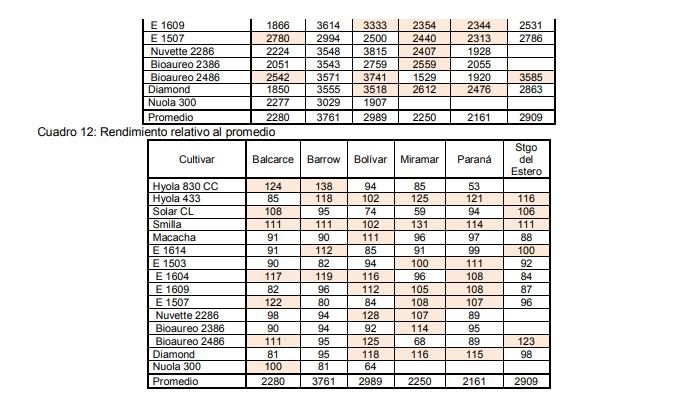 Los cultivares sombreados son los que presentan rendimiento mayor al promedio del ensayo. El cultivar Smilla presenta un rendimiento superior al promedio en todas las localidades. Otros materiales como Hyola 433 presenta mejor rendimiento en 5 de las 6 localidades evaluadas.