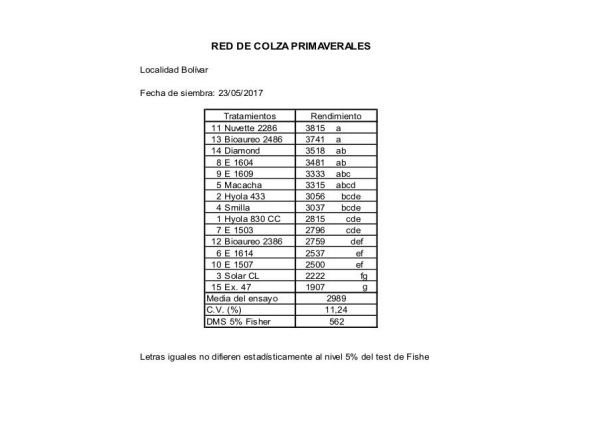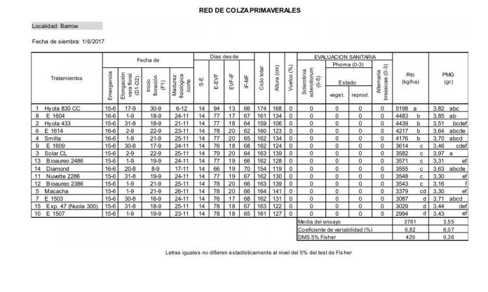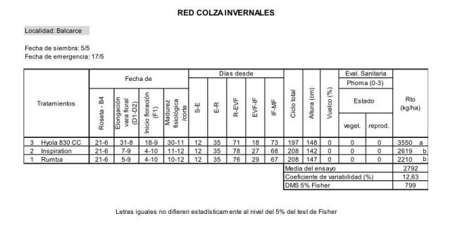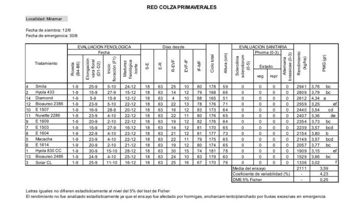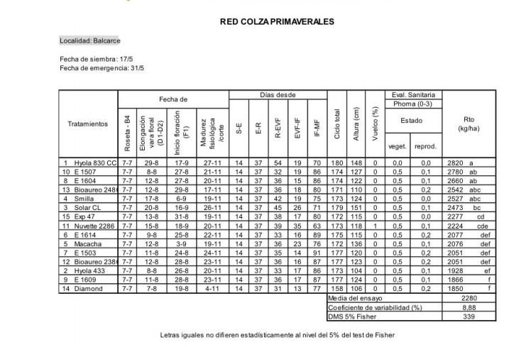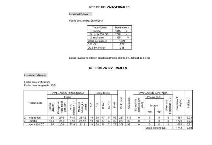Comentarios finales: Desde el punto de vista climático fue un invierno con temperaturas muy moderadas en el centro sur y sudeste de la provincia de Buenos Aires. Muy bajas temperaturas y heladas importantes en el norte y oeste de Buenos Aires. Estas condiciones afectaron especialmente la implantación de los ensayos en varias zonas de evaluación. En Barrow las temperaturas moderadas y las lluvias abundantes y oportunas explican los rendimientos excelentes que se dieron en este ambiente. El mayor número de heladas de las que poseemos registro se presentaron en Bolivar en el mes de junio junto con las precipitaciones más importantes. En lo que respecta a cultivares invernales, solamente 3 se encuentran en evaluación. El mayor rendimiento 4.559 kg/ha se dio en Barrow. EL menor rendimiento 1.649 kg/ha en Bolivar. El cultivar Hyola 830 fue evaluada en la red de cultivares invernales y en la de primaverales. Como invernal registro un rendimiento mayor al promedio del ensayo en las tres localidades. En lo que respecta a las primaverales, se evaluaron 10 cultivares comerciales, en su mayoría híbridos y 5 líneas promisorias del programa de mejoramiento de INTA. La localidad con mayor rendimiento fue Barrow con 3.761 kg/ha. El hibrido Smilla se ubicó por encima del rendimiento promedio en las 6 localidades. En lo que respecta a sanidad no se presentaron enfermedades de importancia en ninguna de las localidades. Próximamente se informaran los valores de aceite que se están procesando en el laboratorio de calidad de la Chacra Experimental de Barrow.