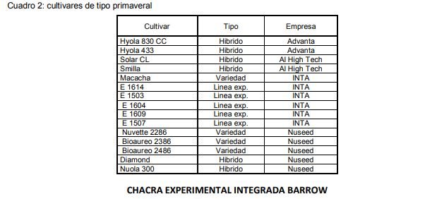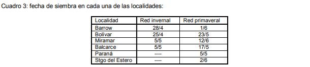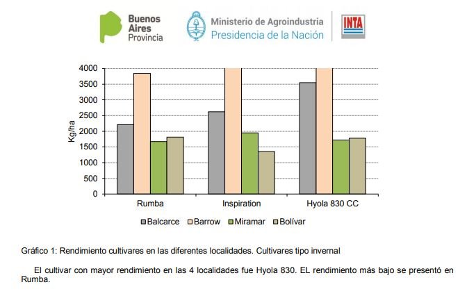 Se evaluaron 3 cultivares de tipo invernal en Barrow, Miramar, Balcarce y Bolívar. Los cultivares evaluados fueron: