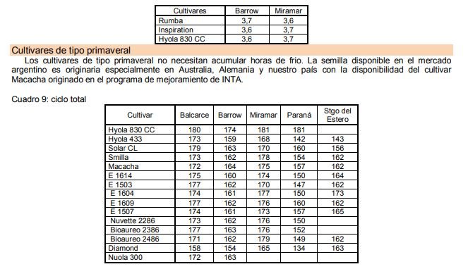 EL cultivar más corto presente en el mercado es Diamond hibrido de origen australiano. El cultivar mas largo es Hyola 830 que en esta oportunidad ha sido evaluado en las redes invernal y primaveral, dado que es un cultivar que presenta algún requerimiento de frio pero no es estrictamente invernal.
