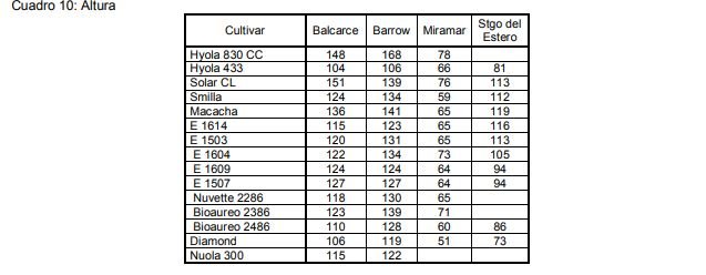 - altura Se informa el ciclo total y la altura. El resto de las observaciones realizadas se incluye para cada localidad en particular en el anexo.