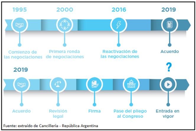 Además, el acuerdo Mercosur-UE, más allá del cierre de negociaciones del 2019, aún no ha sido firmado por los estados miembro o ratificado por sus parlamentos. La entrada en vigor del acuerdo requiere necesariamente estos dos procedimientos en todos los países tanto de la UE como del Mercosur. Sendas firmas y ratificaciones en cada país dependen de la dinámica política de cada miembro, lo que podría dilatar el acuerdo por muchos años.