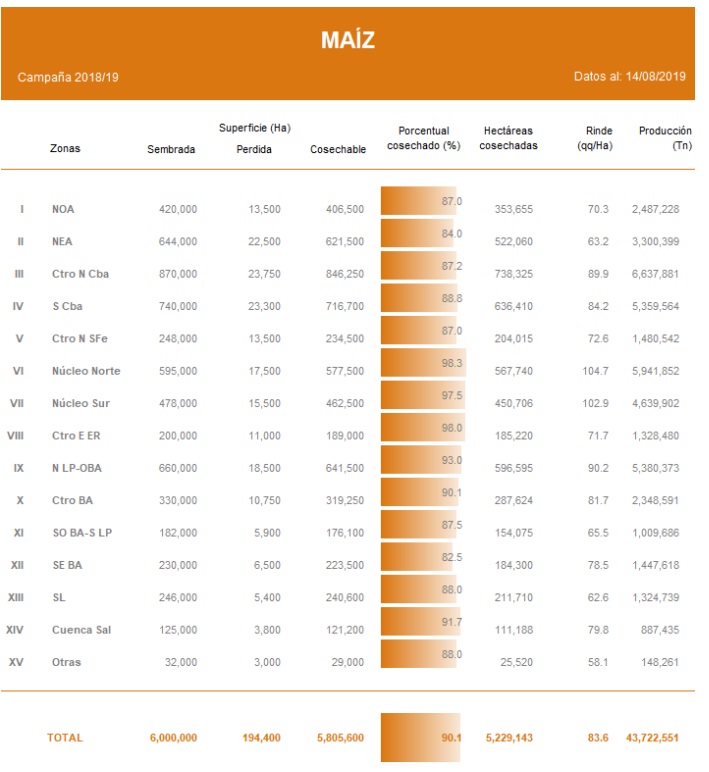Hacia la región del NOA, luego de una semana con importantes avances de cosecha, se acumula una producción parcial de casi 2,5 MTn. Aún restan por recolectar unas 50.000 Ha del cereal concentradas en las provincias de Salta y Tucumán. Sobre la zona del NEA el avance de cosecha ya se ubica en 84 %, con un rinde medio de 63,2 qq/Ha. A la fecha aún se relevan lotes con problemas de falta de piso en el extremo sur de la provincia de Chaco. Hacia las zonas Oeste de Buenos Aires-Norte de La Pampa, Cuenca del Salado y el Centro de Buenos Aires se relavan importantes progresos en la recolección de lotes tardíos. Sobre la provincia de Córdoba la cosecha de maíz tomó un fuerte impulso producto de la baja en los niveles de humedad de los granos.