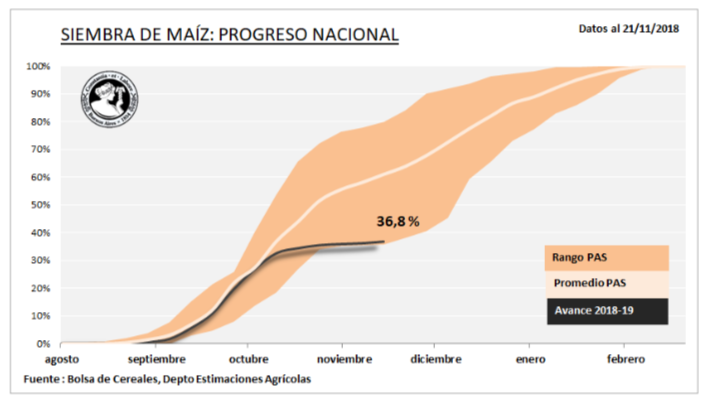 Desde nuestro informe previo continuaron incrementándose las reservas hídricas en parte del área agrícola y las siembras de lotes tempranos se concentran solo en la provincia de Buenos Aires. Por otro lado, gran parte de los cuadros afectados por las heladas continúan recuperándose. El avance de siembra a la fecha se ubica en el 36,8 %, marcando un progreso intersemanal de solo 0,6 puntos porcentuales. Frente a este panorama mantenemos la proyección de maíz con destino grano comercial en 5.800.000 hectáreas. Esta superficie representa en números absolutos 300.000 hectáreas más que las sembradas la campaña previa (Campaña 2017/18: 5.500.000 Ha).