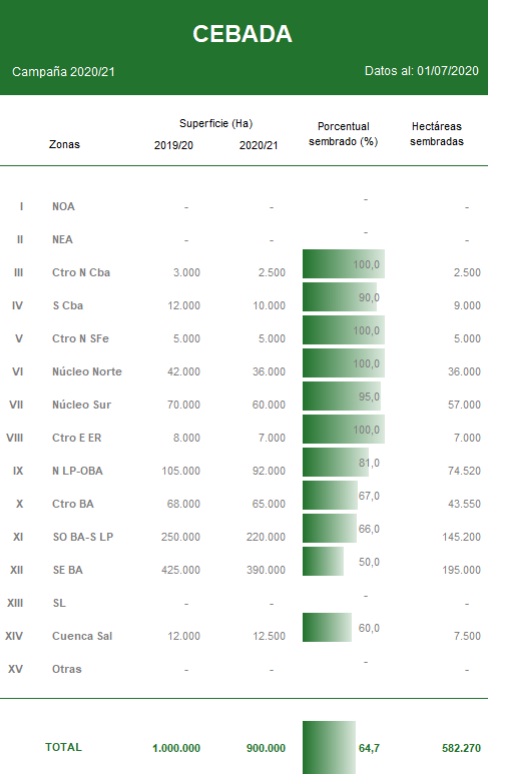 El avance de siembra cubrió el 64,7 % de las 900 m/ha proyectadas para la campaña 2020/21, registrando un progreso interquincenal de 41,2 puntos porcentuales y manteniendo un adelanto interanual de 14,8 puntos.
