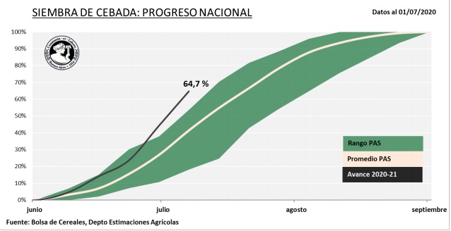 Avanza la siembra, concentrando su mayor actividad en sectores con buena humedad superficial en Buenos Aires. A la fecha se estima que el avance interquincenal superó los 41 puntos porcentuales y permitió elevar el progreso nacional de siembra al 64,7 % de las 900.000 hectáreas proyectadas para la campaña 2020/21. En comparación a similar fecha del ciclo previo, se registra un adelanto interanual de 14,8 puntos porcentuales.