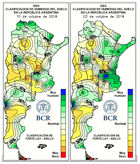 A pesar de que se sembraron 350 mil hectáreas este año, la producción apenas alcanzaría los 5,13 Mt, contra los 4,97 de la campaña pasada. Con 8,3 quintales menos de rinde que en el 2017/2018, la posibilidad del repechaje ante la sequía del verano se evapora por otro episodio de falta de agua. Un 30% de los trigos de la región está comenzando el llenado de granos. Gran parte de ellos están ubicados en el centro-sur de Santa Fe y este de Córdoba, las áreas con menores reservas de agua de la región. La necesidad de agua es inminente. La escasez tambien deja vulnerables a los cuadros que vienen detrás, cómo el 40% que está en espigazón y floración, y a los más atrasados que tienen la espiga embuchada, el 30% restante. Tras las heladas y sin el auxilio del agua, en esta semana los cuadros en malas condiciones ocupan el 15% del área, los regulares el 25%. Los daños por las heladas en el sudeste de Córdoba fueron de tal magnitud, que se está evaluando en pasar un desecante para sembrarlos con soja de primera.