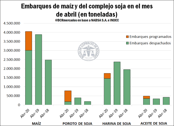 Hasta el 22 de abril, en base a datos de la agencia marítima NABSA S.A., se embarcaron desde los distintos puertos argentinos 3,0 millones de toneladas de maíz. En tanto, en los días que quedan pendientes para finalizar el mes, hay programados despachos por cuenta de 1,0 Mt que, de concretarse, permitirían cerrar el mes con 4,0 Mt de cereal exportadas, superando el registro del año previo. Sin embargo, se encuentra dentro de las posibilidades que no se puedan cumplir la totalidad de los embarques programados para la semana que resta de abril, ante la baja profundidad del río Paraná, y parte de estos se trasladen a mayo.