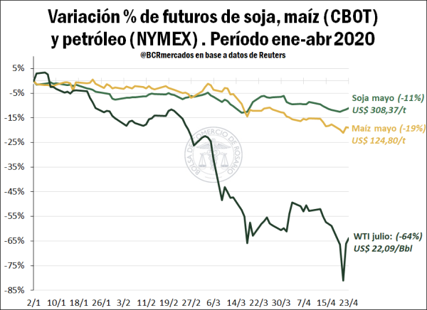 En este contexto, a pesar de que los mercados de soja y maíz se encuentran correlacionados con la evolución del crudo, no se observa un gran impacto en sus cotizaciones. Considerando ambos cultivos, el más afectado ha sido el maíz con una caída acumulada del 19% desde comienzos de año, lo cual tiene sentido en el mayor impacto que se prevé en la industria del etanol estadounidense debido a las actuales cotizaciones del petróleo. Por su parte, la soja presentó menos pérdidas acumuladas que se ubican en el 11% respectivamente. De esta forma, dichos valores se encuentran muy distantes del desplome del petróleo que actualmente acumula pérdidas del 64% en la posición julio desde comienzos de año.