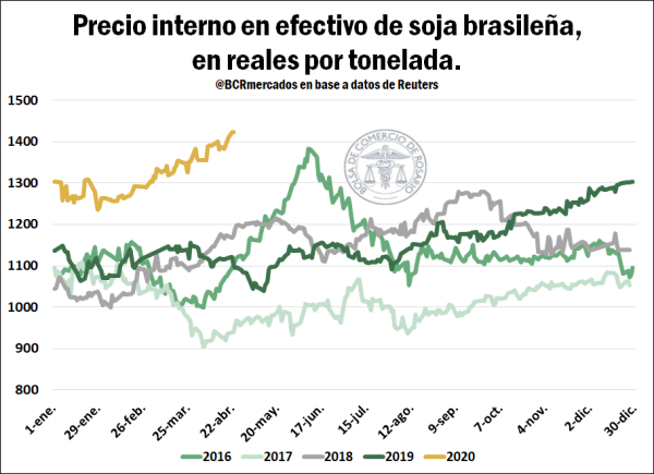 Los fundamentos de las importantes exportaciones del país vecino, se pueden relacionar con los altos precios que se están recibiendo internamente por la oleaginosa. En la actualidad, la cotización para la soja se ubica en los R$ 1423/t. Si se compara con años anteriores, se encuentra en máximos históricos al menos desde 2016 y un 30% más que el año previo. Esto se debe, en gran parte, a la fuerte depreciación que ha sufrido el real brasileño en relación al dólar estadounidense. En efecto, en lo que va del año la moneda brasileña ya perdió el 30% de su valor respecto a la divisa estadounidense mejorando su competitividad externa.