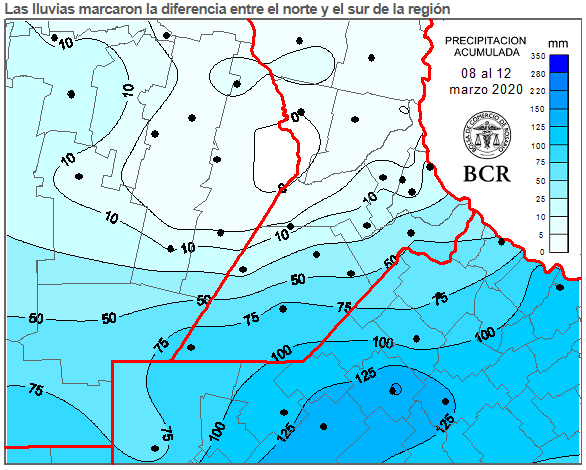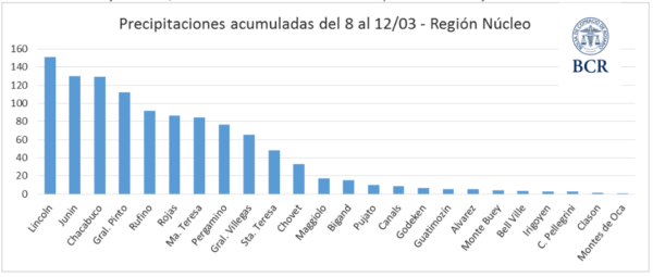 Las lluvias alcanzaron solo a la mitad sur de la región. Los acumulados superaron los 100 mm en el norte de Buenos Aires. En estos 4 días de lluvias, Junín acumuló 130 mm y Lincoln 150,8 mm. En el extremo sur de Santa Fe los milimetrajes estuvieron entre 30 y 100 mm.