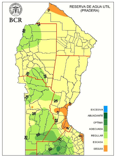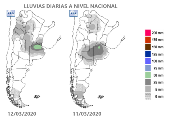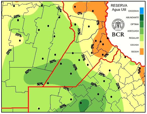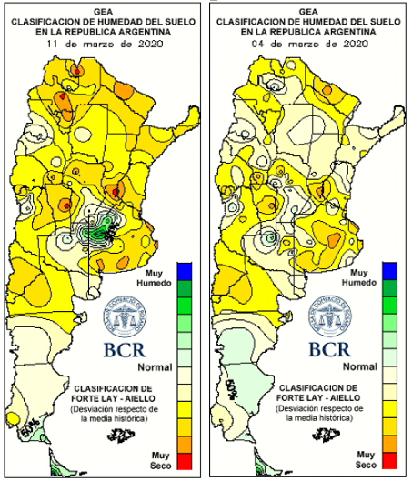 Las condiciones de humedad del suelo han mejorado notablemente en las últimas horas, aunque siguen siendo muy dispares debido a la dispersión que tuvieron las precipitaciones. Se observan características adecuadas en zonas del sudeste de Córdoba, noroeste de Buenos Aires y el extremo sudoeste de Santa Fe, mientras que se mantienen sectores con humedad escasa sobre el extremo sudeste de Santa Fe, incluso con zonas con características de sequía —en este análisis no se tienen en cuenta las lluvias registradas en la jornada de ayer miércoles 11 de marzo, por lo que se espera que la próxima semana se observen cambios significativos en algunos sectores—.