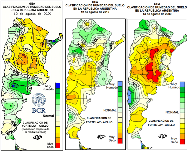 Tal como puede evidenciarse en la imagen precedente, parte del sudeste de Santa Fe y, principalmente el oeste cordobés son las zonas de mayor presencia de sequía de la zona centro. En Córdoba, la superficie caería en 340.000 ha comparado con el ciclo 2019/20. No obstante, esta merma sería contrarrestada parcialmente con el aumento interanual de 170.000 ha sembradas en Buenos Aires.