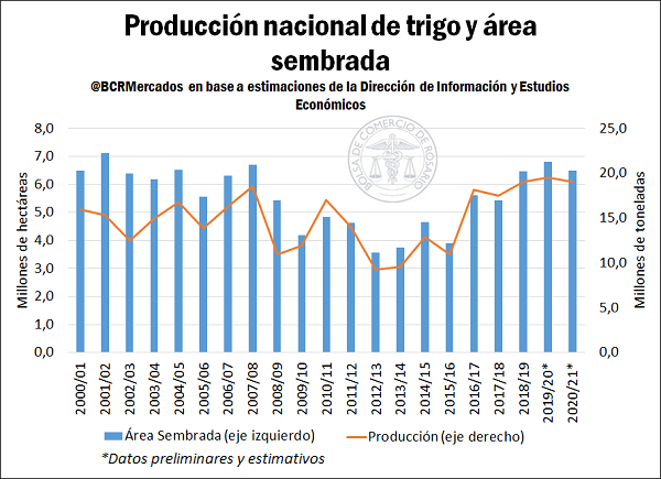 Las 6,5 M ha que se proyectan de siembra de trigo 2020/21 representan el segundo registro más elevado desde la campaña 2008/09, encontrándose sólo por detrás del período comercial 2019/20, cuando se cubrieron 6,8 M ha.