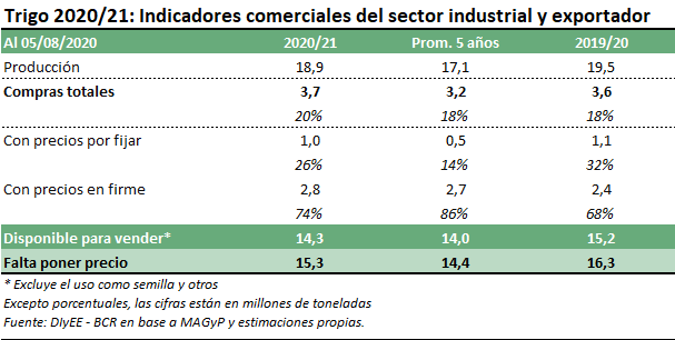 A pesar de las dificultades que se plantean para la próxima cosecha triguera, la comercialización mantiene un ritmo superior a lo que sucedía un año atrás, y por encima también del promedio de los últimos 5 años, tal como muestra la tabla adjunta. A la fecha, según registros oficiales, industriales y exportadores han comprado 3,7 millones de toneladas de trigo nuevo, por encima tanto de los 3,6 anotados a la misma altura del año anterior como de los 3,2 Mt promedio de los últimos cinco años. Con el recorte en la producción, ello significa que ya se ha negociado el 20% de la producción estimada, superando el avance en la comercialización de los años anteriores.
