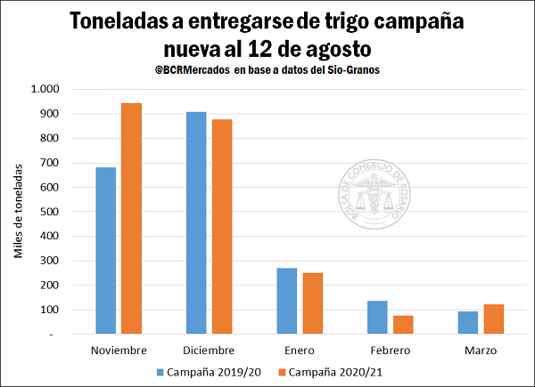 En cuanto a los precios, en la última semana de comercialización en la plaza rosarina los valores del cereal han pasado de US$ 188,97/t el 06/08/2020 a US$ 186,53/t el 13/08/2020, lo que representa una caída de 1,29%.