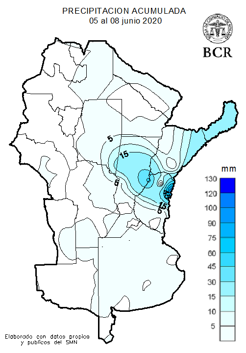 Se esperaban precipitaciones de variada intensidad y viento fuerte sobre el noreste de la provincia de Buenos Aires, Entre Ríos y Santa Fe en el pasado fin de semana, entre el 5 y el 8 de junio. Pero la cantidad de agua fue muy escasa; no hubo más que lloviznas y tiempo húmedo en gran parte de la franja este de Argentina, incluyendo a Buenos Aires, el sur de Santa Fe y este de Córdoba. Sólo parte del centro y norte de Santa Fe recibió entre 5 y 30 mm junto con el norte de Entre Ríos. En el sector del extremo NE de entrerriano los valores superaron los 50 mm.