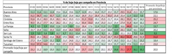 Tabla 1: Porcentaje de soja sobre soja por campaña por provincia (Fte.: S4 Agtech)