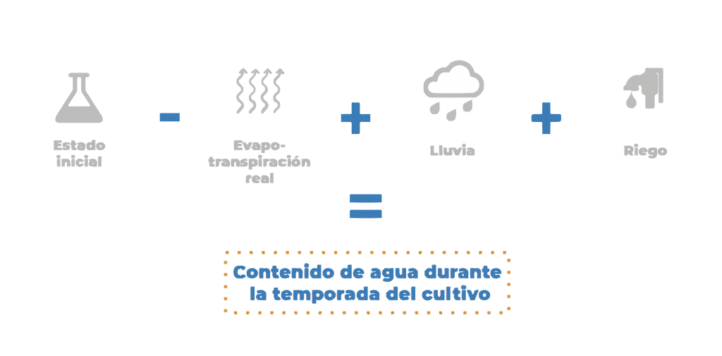 En un estado inicial, se realiza una caracterización del suelo y se determinan las constantes hídricas y el agua útil de cada lote. A ese estado inicial se resta la evapotranspiración real del cultivo (ETr), es decir la evaporación de agua del suelo y la transpiración real del cultivo en las condiciones actuales de cobertura de cada lote en particular (FAO 1990). Una vez calculada la pérdida de agua, que resulta de la diferencia del estado inicial menos la evapotranspiración real del cultivo, se suma al sistema la cantidad de lluvia caída y el riego aplicado en cada lote, obteniendo así los resultados de agua útil para dar las recomendaciones de riego exactas día a día.