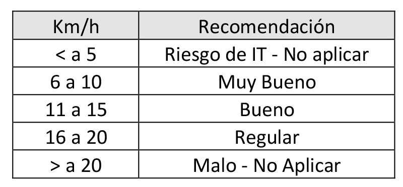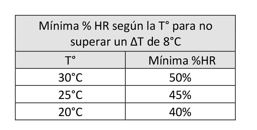 En todos los casos los valores obtenidos van a ser en °C, se recomiendan realizar las aplicaciones cuando dicho valor este entre 2 a 8 °C, ya que si el valor es superior al rango, las gotas disminuyen de tamaño haciéndose susceptibles a la deriva y las que ya están depositadas se secan rápidamente limitando el ingreso del activo a la planta. Y en el caso de un valor inferior a este rango las gotas más pequeñas que ya son propensas a la deriva por su tamaño, permanecen más tiempo en estado liquido pudiendo recorrer mayor distancia (derivar) y teniendo mejores condiciones de ingreso a la planta por permanecer más tiempo húmedas. A continuación, y a modo de referencia, se muestra una tabla que indica los valores de %HR mínima necesaria