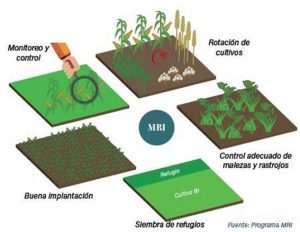 Es por ello que la industria semillera desarrolló y unificó sus recomendaciones para el manejo de resistencia de insectos (MRI), basándose en un buen manejo del lote con el objetivo de mantener una frecuencia muy baja de individuos resistentes. Este manejo incluye (Imagen 1):