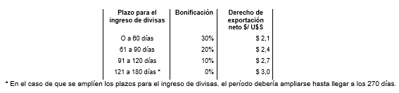 Así, por ejemplo, si las divisas se ingresan dentro de los primeros 60 días contados desde la oficialización de la exportación, el derecho de exportación se bonifica 30%, pasado de 3 $/dólar a 2,1 $/dólar, si se ingresan entre 61 a 90 días; la bonificación es del 20% y así hasta llegar a los 270 días. De esta manera se estaría incentivando el ingreso de divisas al país, al tiempo que los exportadores obtienen un estímulo específico para acelerar el ingreso. El pago de derechos de exportación se debería efectivizar al momento de recibir el dinero de las cobranzas.