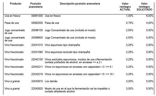 El análisis exhaustivo de la cadena señala que los valores de reintegro actuales son inferiores a los impuestos que tributan los productos vitivinícolas, por ello se solicitan los siguientes incrementos: