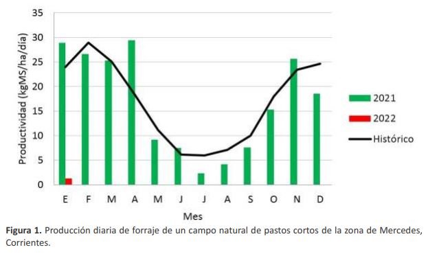 Los recursos forrajeros estivales, base de la ganadería de la región, tienen un importante potencial de producción, pero también una alta variabilidad entre años. Particularmente para el campo natural (95% de la superficie ganadera en Corrientes), las precipitaciones o el balance hídrico de verano determina buena parte de la producción anual de forraje. Como puede observarse en la figura 1, la producción de verano se afectó tanto en diciembre del 2021 como en enero del 2022 lo que suma un déficit de aproximadamente 1 TnMS/ha.