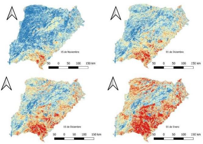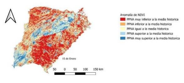 Esta situación es consecuencia de las bajas precipitaciones y altas temperaturas de enero 2022 que estuvieron muy por encima de lo normal (Escalante et al., 2022). Ambas variables determinan un balance hídrico negativo muy por debajo de lo normal lo que repercute sobre la producción de forraje. A su vez, según el modelo desarrollado por Arias (2006) para la zona, aunque se repare el nivel de precipitaciones la producción de forraje para el 2022 será al menos un 40% menos que para un año normal. Para poder observar ésta misma situación a escala provincial se muestran los siguientes mapas: