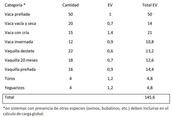 Toros. Se revisan, eliminando los que presentan problemas físicos o clínicos: viejos, con enfermedades infecciosas, problemas locomotores, de aparato reproductor, etc. Una vez que se ha hecho la selección de los animales en mejores condiciones para pasar el período crítico se debe proceder a ajustar la carga en cada potrero. Es importante clasificar las vacas por estado de preñez: cabeza, cuerpo y cola de parición. Las primeras parirán en julio y agosto, en los primeros 2 meses de lactancia sufrirán la falta de forraje. Las vacas cola, con parición en septiembre y parte de octubre, tendrán un mejor balance entre demanda y oferta de forraje, dado que los primeros meses de lactancia coinciden con un buen crecimiento del pastizal. Por lo tanto, pueden manejarse a una carga diferencial, las primeras a menor carga que las últimas. Una de las categorías más comprometidas es la vaquillona preñada. Son las que tienen más requerimientos nutricionales por unidad de peso corporal. Normalmente paren temprano, una deficiencia forrajera afectará su desarrollo corporal y reproductivo. Es importante ir programando con tiempo un destete precoz para esta categoría. Es la única posibilidad de preñarlas en su segundo servicio.