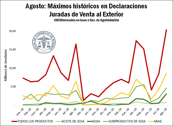 En lo que respecta al comercio exterior, el mes de agosto fue intenso en la evolución de las ventas externas de la República Argentina. Las Declaraciones Juradas de Venta al Exterior (DJVE) alcanzaron un tonelaje mensual histórico, de 20,3 millones de toneladas para todos los productos del rubro agroindustrial. También las ventas externas de maíz registraron un récord mensual, del orden de 8,6 Mt. Por su parte, en el complejo soja las declaraciones de poroto, aceite y subproductos cuantificaron 3,1; 0,8, y 4,6 Mt, respectivamente. Estos registros podrían estar relacionados a la incertidumbre interna sobre el futuro de las políticas que pueden influir sobre el sector, a lo que se suma un tipo de cambio que resulta competitivo para la actividad exportadora.