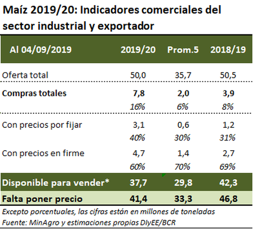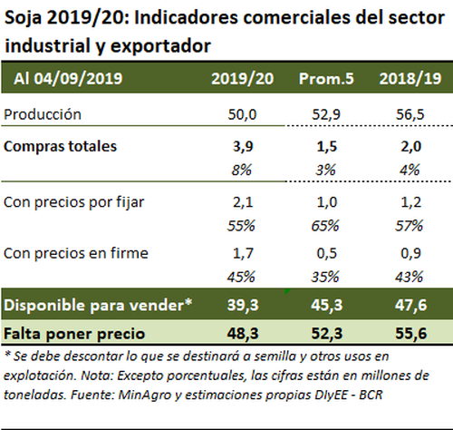 En cuanto a la soja, al 4 de septiembre exportadores e industriales llevaban compradas 34,9 Mt, un 62% de la producción estimada para la campaña 2018/19. Quedarían disponibles para comercializar unas 14,8 Mt, un margen holgado respecto del promedio de las últimas 5 campañas, de 12,3 Mt.