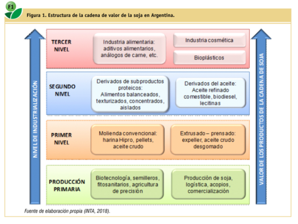 Respecto a la comercialización de estos productos, se observa que los principales destinos del aceite desgomado son: las empresas tradicionales refinadoras y productoras de aceite y biodiesel, el biodiesel de autoconsumo, aceite metilado para uso agrícola, empresas de pinturas, etc. Por otro lado, el expeller se comercializa generalmente en un radio de 50–60 km de la planta procesadora con destino a alimentación animal. Es decir, como ración para feedlots, tambos, granjas aviares y porcinas, fábricas elaboradoras de alimentos balanceados. Sin embargo, existen empresas que procesan este subproducto proteico y lo transforman en texturizados de soja y harina micronizada. Finalmente, el análisis del estudio global de esta cadena indica que a pesar de representar la mayor fuente de ingresos para la economía del país, aun en la actualidad sólo posee un primer nivel de industrialización desarrollado. Es por ello, que nuestro desafío como tercer productor mundial de soja es, además de producirla sustentablemente, transformarla y exportarla bajo el formato de productos industrializados, con alto valor agregado y mayor mano de obra argentina, bajo la modalidad de Pymes asociativas de escala y tecnología competitiva. De este modo, sería posible aumentar significativamente los ingresos en Argentina y mejorar su distribución en el interior productivo.