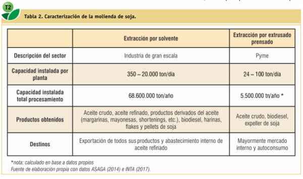 De dichos relevamientos, además, se concluye que la capacidad instalada promedio de procesamiento de soja por planta ha variado de 24 a 50 toneladas diarias y la mano de obra agrupada alcanza los 3.500 puestos laborales de modo directo. Este tipo de empresas son un ejemplo concreto de desarrollo territorial, dado que aportan al sistema productivo agropecuario: disminución del costo de flete de la soja, mano de obra directa e indirecta y, a los productores pecuarios, la posibilidad de incorporar productos proteicos en sus raciones para aumentar su eficiencia de producción. Es pertinente señalar que a medida que estas plantas se alejan del puerto de Rosario la rentabilidad de las mismas aumenta por apropiación del costo del flete.