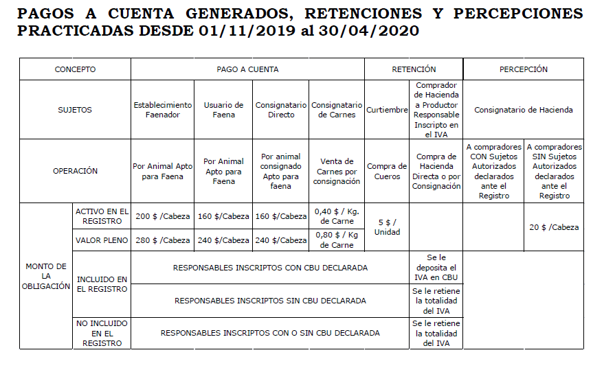 Los usuarios de faena que compren hacienda de manera directa al productor y que estén incluidos en el “Registro Fiscal de Operadores de la Cadena de Producción y Comercialización de Haciendas y Carnes Bovinas y Bubalinas”, deben pagar IVA a cuenta por un monto de 80 $/cabeza faenada, mientras que, en caso de no estar activo en el Registro, deberá abonar 120 $/cabeza. A partir del próximo 1 de noviembre tales montos serán ajustados en 160 y 240 $/cabeza respectivamente.
