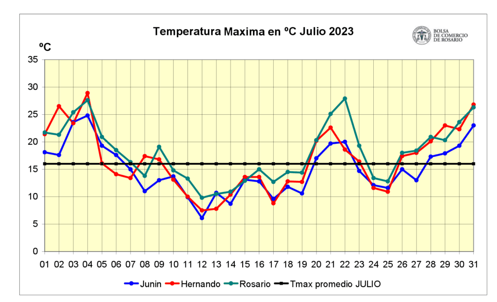 En Julio, las temperaturas máximas mostraron una evolución atípica con registros muy altos para la época del año. Hubo 3 picos de casi 30ºC, duplicando así la media mensual para la región que ronda los 15 °C. No se trató de un evento aislado, las máximas se sostuvieron 4 a 6 días. Se pueden identificar hasta tres ciclos dentro del mes con este mismo comportamiento. Como ejemplo de máximas, en Junín, Rosario y Hernando en el mes registraron picos 25, 28 y 29 °C respectivamente, es decir entre 10 y 14°C por encima de los registros normales  históricos.