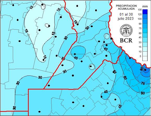 En julio suelen llover entre 10 mm, en el sector oeste, a 30 mm en el este. Sin embargo el promedio acumulado mensual de toda la región es de 34 mm, un 70% más que lo normal. Pero cómo se ve en el mapa, las localidades de la franja este son las que se quedaron con la mayor carga de agua. Y aparte, esas lluvias se produjeron casi en su totalidad en la primera quincena. Hay registros que están fuera de lo normal en algunos sectores de GEA. Por ejemplo, los 107 mm de Baradero, o los 85 de Ramallo. O incluso los 54,6 mm de Godeken.