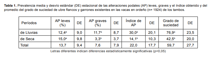 El objetivo fue estimar la prevalencia de afecciones podales (AP) en vacas en ordeñe de 16 tambos de Salta y sus relaciones con su grado de suciedad (GS) y pérdidas productivas.. El presente trabajo refleja el perjuicio que ocasionan las AP sobre los índices productivos, la salud y el bienestar de las vacas.