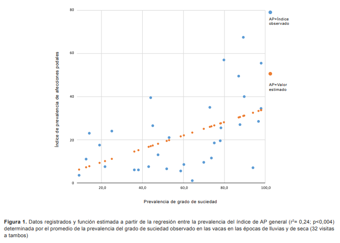 Las prevalencias estacionales y totales de las AP y del grado de suciedad están señaladas en la tabla 1; éstas corresponden para todo el período de registros de 1924 vacas observadas, de las cuales 264 presentaban AP leves y 152 AP graves y 1149 con suciedad en alguna de las zonas inspeccionadas. Se observaron diferencias significativas (p<0,008) entre las prevalencias de las AP graves, el índice de AP y el grado de suciedad de las vacas de los períodos de lluvias y de seca. En general las AP de las vacas se presentaron en un 85,7% en los miembros posteriores y en un 14,3% en los anteriores. Se hallaron asociaciones positivas entre la prevalencia de AP graves (r2= 0,29; p><0,002) y del índice de AP general (r2= 0,24; p><0,004) determinados a partir del promedio de la prevalencia del grado de suciedad de las vacas (Figura 1). Los datos de los registros del software de gestión “DIRSA” observados muestran que durante la lactancia estudiada, un 64,9; 16,2 y 18,3 % de las vacas con AP presentaron 1, 2 y ≥ de 3 eventos de AP; un 19% tuvieron AP en la lactancia previa y 22% repitieron AP en más de una ocasión en la lactancia siguiente. La tabla 2 muestra las diferencias entre el rinde de las lactancias de los registros de las vacas con AP y las lactancias anteriores y posteriores de las mismas. >