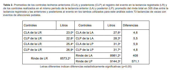 Los tambos, que promediaban 190 ±88,4 vacas en ordeño, fueron visitados dos veces en el año de acuerdo al régimen de lluvias, una durante la época de seca (junio-agosto 2014) y la otra durante la época de lluvias (febrero-marzo 2015). En cada visita un mismo evaluador registró la prevalencia de AP y del grado de suciedad en vacas en ordeñe. El número de vacas observado fue calculado de acuerdo al total de vacas en ordeñe de cada tambo de acuerdo a lo normado por el Welfare Quality (2009)16. El promedio de vacas en ordeñe de los establecimientos fue de 220±30, por lo que el número de animales evaluados fue de entre 65-70 por tambo/visita. Cabe destacar que los animales a observar se seleccionaron al azar. Para las AP se tomaron como positivas los casos con grados de cojera 3, 4 y 5, teniendo en cuenta la escala establecida por Sprecher y col.17. Estos datos se discriminaron como cojeras leves (grado 3) y graves (grados 4 y 5) y a partir de las prevalencias de las AP leves y graves de cada rodeo se elaboró un índice de cojeras (IC= grado 3*0,5 + grados (4+5)*2)18, para representar en forma ponderada de acuerdo a la gravedad de las AP la prevalencia en cada tambo. En cuanto al grado de suciedad que presentaban las vacas en el flanco, ubre y garrón se evaluó de acuerdo a la calificación descripta en el Welfare Quality (2009)16. La prevalencia se obtuvo tomando el promedio de las prevalencias de las tres zonas corporales. Por otro lado, de los registros del software de gestión “DIRSA” de 3 de los tambos visitados se relevaron datos del tambo y del total de eventos del ganado de los últimos 10 años. A partir de estas bases de datos se observó en las vacas de ≥ a 3 lactancias registradas con AP (n= 73), las diferencias entre su producción de leche total, previa y posterior a la lesión con los mismos registros en su lactancia previa y posterior a aquella donde ocurrió su claudicación. Además, se registró su intervalo parto-parto (IPP) y el número de servicios posteriores necesarios para lograr preñez y su destino final ya sea que continúa en el tambo, descarte o muerte. También esto último se registró en vacas sanas sin AP (n=28) de ≥ a 3 lactancias registradas.