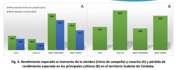 La expectativa de rendimiento promedio al inicio de la campaña y a la cosecha para soja de primera y de segunda, y maíz temprano y tardío se muestra en la Fig. 3. La pérdida de rendimiento fue estimada como la diferencia entre el rinde esperado al inicio de la campaña y el final de la misma. En soja de primera el rinde esperado al final de la campaña sería de 30 q/ha, siendo un 21% inferior al esperado a la siembra. En soja de segunda, la perdida de rinde esperada es de 36% teniendo una producción a cosecha de 20 q/ha. En maíz temprano el rendimiento esperado a cosecha es de 81 q/ha mostrando una reducción de rinde del 19%, mientras que en maíz tardío la pérdida de rinde esperada sería de 31%.
