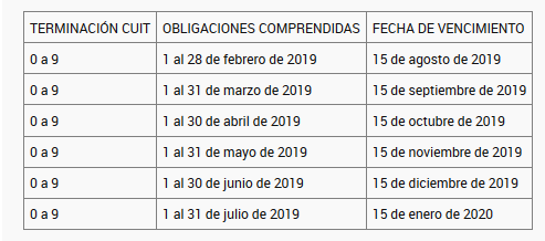 La resolución 4539/19 indica que el pago de las obligaciones con vencimientos fijados durante los meses de febrero a julio de 2019 se considerará cumplido en término siempre que se efectivice hasta las fechas que se indican a continuación: