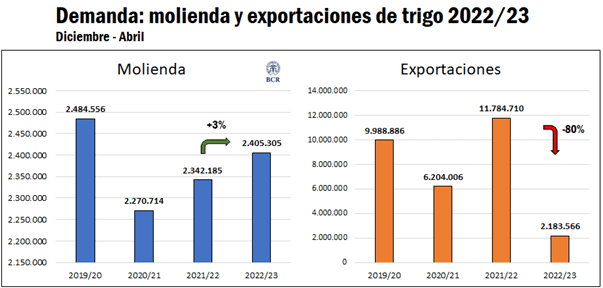 La  molinería viene teniendo un buen desempeño en la campaña actual, habiendo procesado en el período diciembre-abril unas 2,4 millones de toneladas de trigo, un 3% por encima del año pasado y marcando el máximo desde la campaña 2019/20. Las exportaciones de trigo, por el contrario, vienen siendo sumamente escuetas, habiéndose embarcado al exterior en los primeros 5 meses de la campaña apenas 2,1 millones, un 80% por debajo de la campaña pasada.