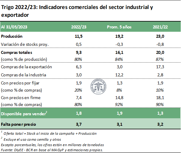 Según nuestras estimaciones, la molinería podría llegar a demandar en la presente campaña un número cercano a los 6,1 millones de toneladas, de las cuales lleva aseguradas en el mercado interno, según los datos más recientes de SAGyP, unas 3 millones de toneladas. Es decir, la molinería tiene que salir a comprar más de 3 millones de toneladas de trigo de acá hasta que entre la nueva cosecha. La pregunta del millón, y lo que viene catapultando los precios del disponible, es si queda ese trigo por vender en un año en que la producción cayó un 50% entre campañas.