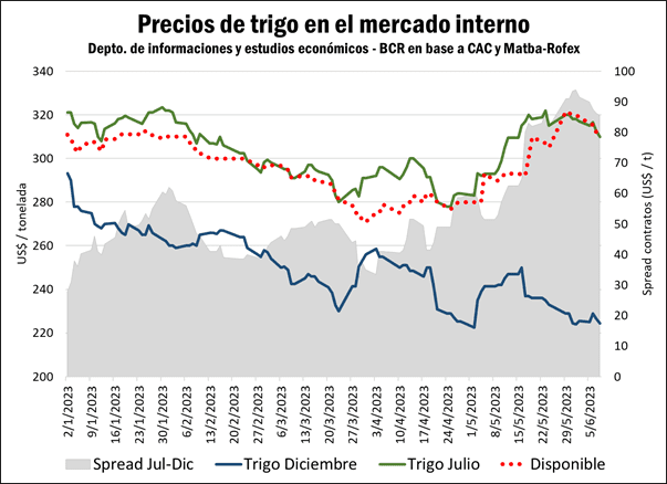 Desde la última semana de abril, el precio del trigo disponible en el mercado local se incrementó en torno a un 12%, ajustando el jueves en un valor cercano a US$ 310 por tonelada; esto contrasta con el desempeño del trigo a cosecha, que se negoció en un rango de precios similar a los de finales de abril, mostrando un ajuste de $ 224,5/t al día jueves.