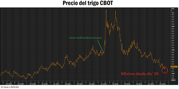 Amén del tímido rebote que experimentaron los precios del cereal en los mercados externos en la última semana, en las últimas ruedas de mayo el trigo tocó mínimos desde diciembre de 2020 en el mercado de Chicago. La renovación del acuerdo sobre el corredor de granos del Mar Negro para las exportaciones de Ucrania, que ahora cuenta con plazo de vigencia hasta el 17 de julio próximo, pareció barrer con el soporte que encontraba el mercado en el corto plazo.